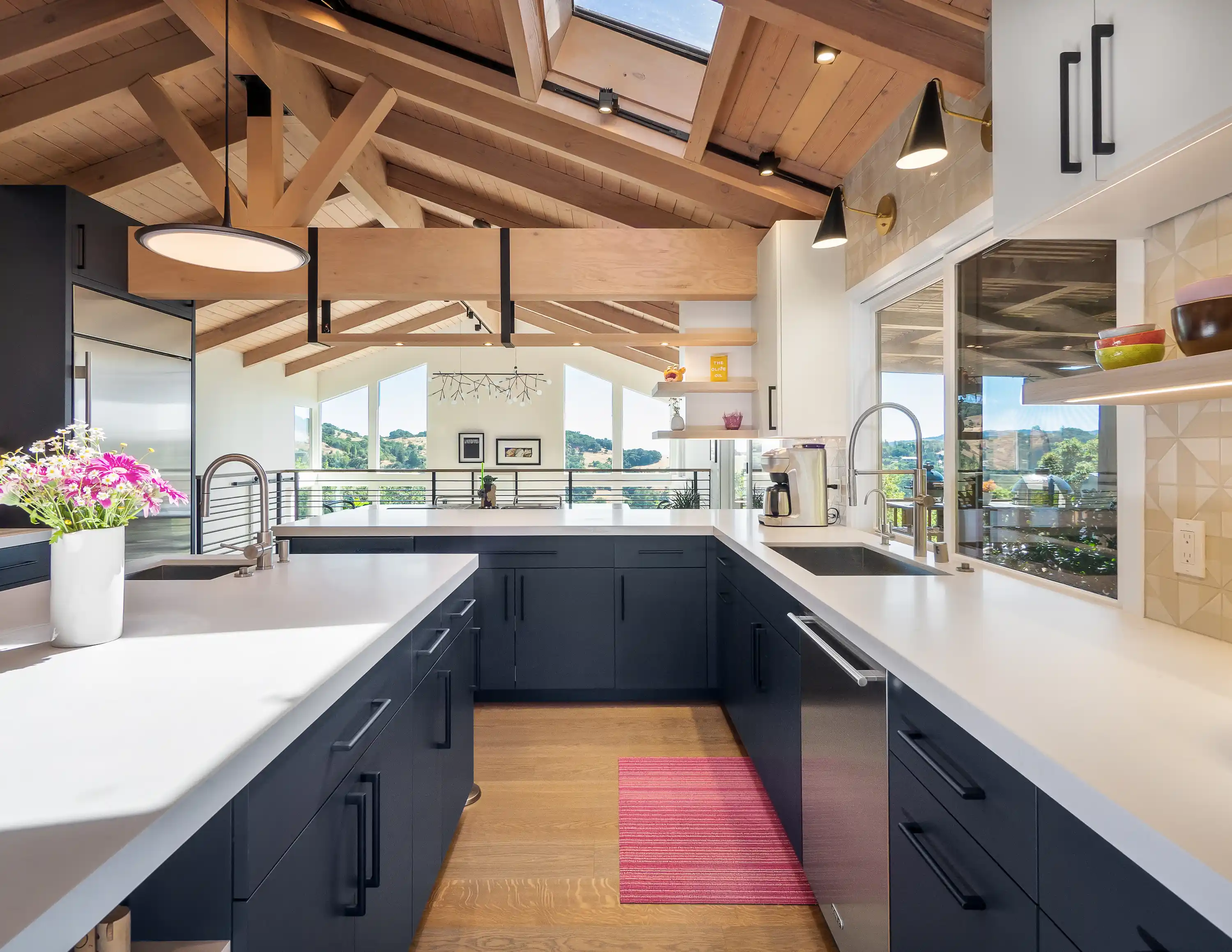 Dramatic wood beams overhead, geometric tile underfoot. A comprehensive renovation that balances raw structural honesty with refined material details.