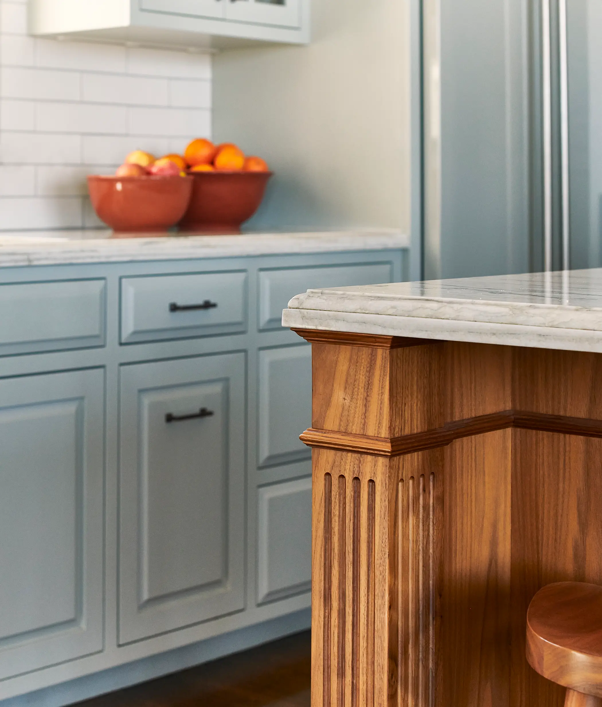 A meticulously crafted kitchen features walnut millwork with fluted detailing, white marble countertops, and professional-grade appliances beneath a custom wood-clad range hood.