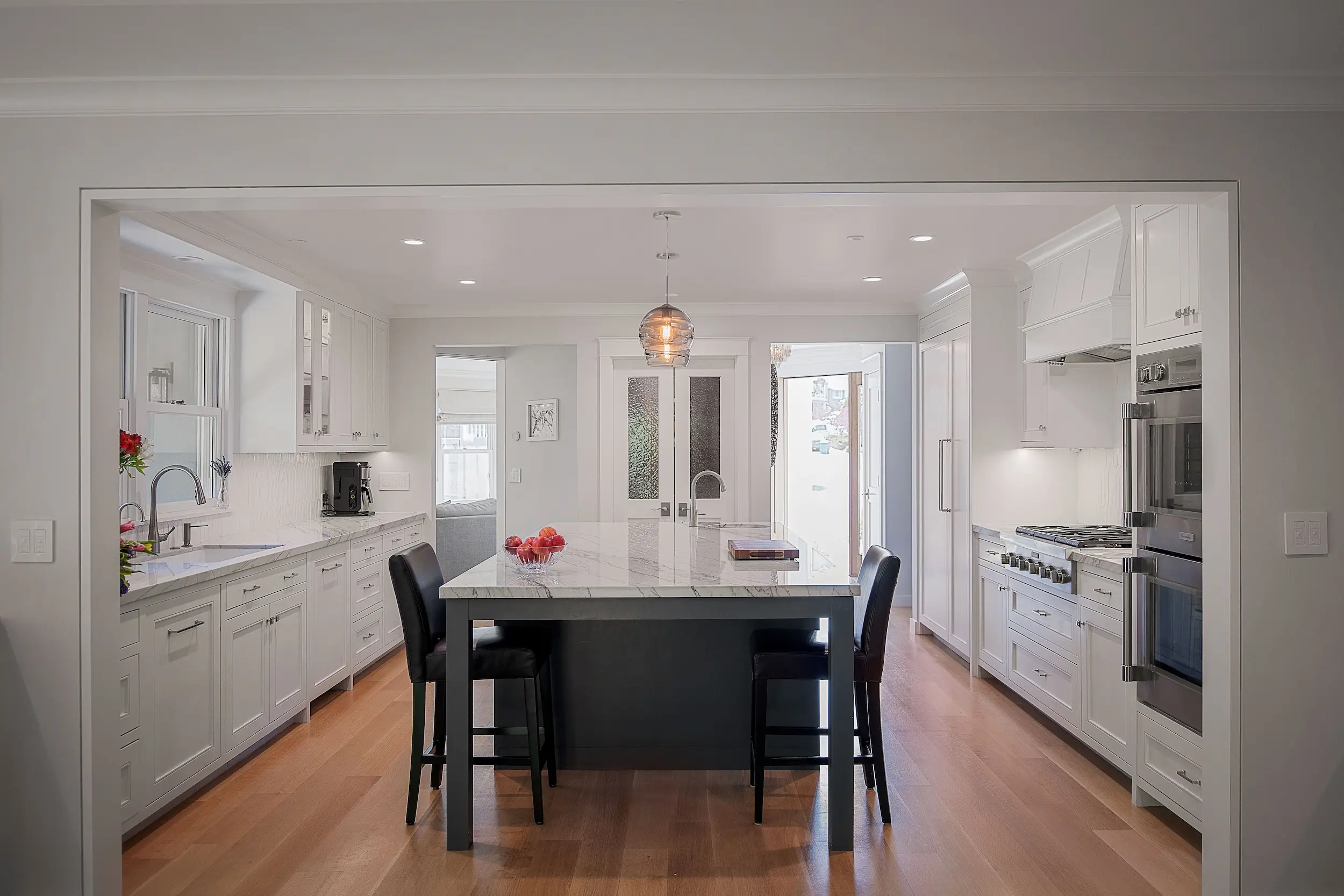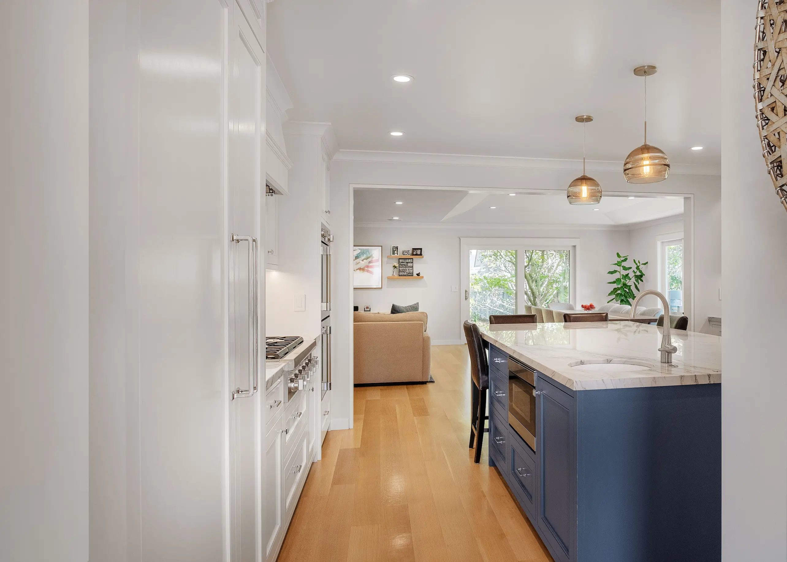 The kitchen now connects visually to the dining and living areas while maintaining its efficient layout. White cabinetry, quartzite counters, and a contrasting island provide ample storage and workspace.
